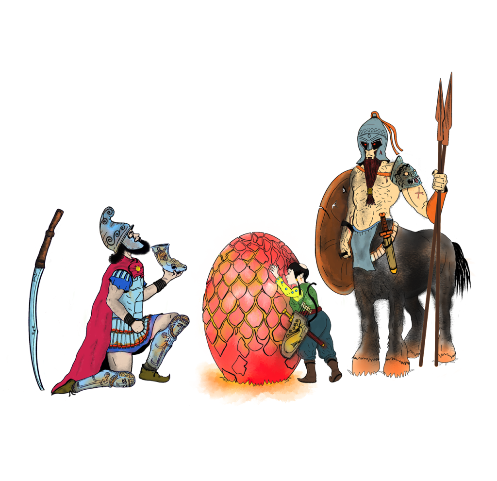 In 2022, I created a #fantasy #drawing that featured a #warrior in Thracian armor, a #hobbit woman dressed in Scythian clothes, and a #centaur equipped with bronze weapons, all gravitating around a #dragon egg. This scene was to be set in a swamp.